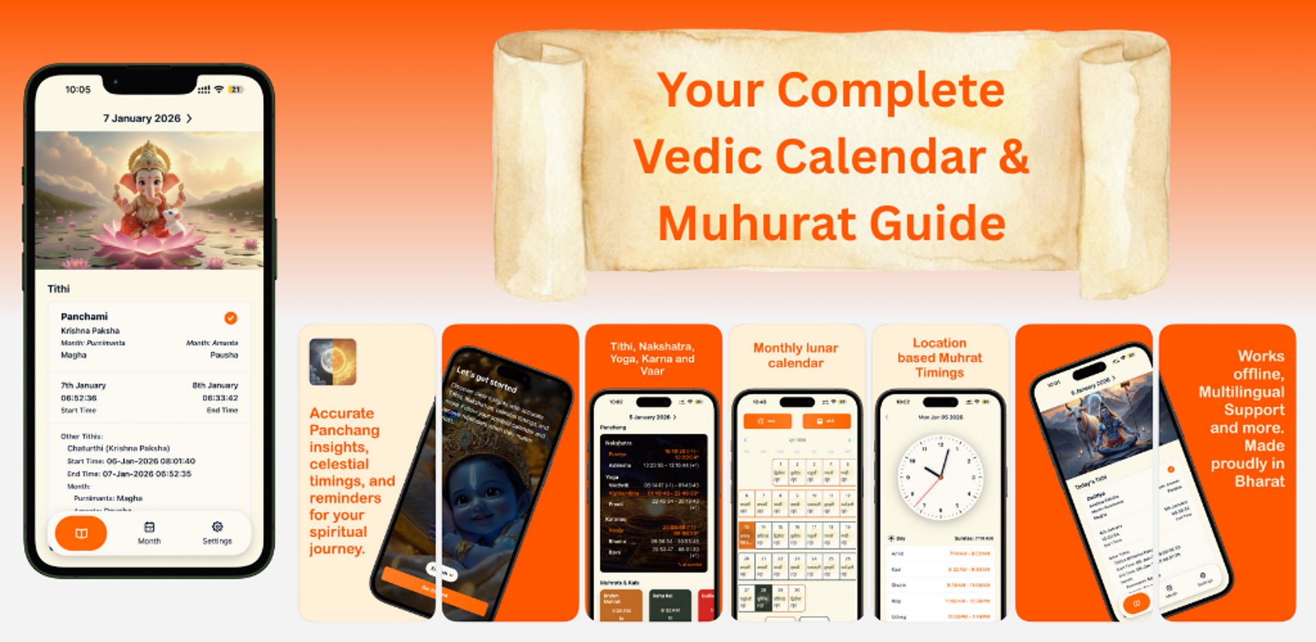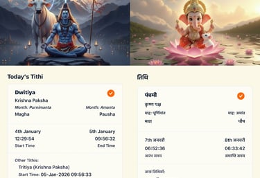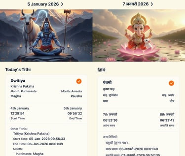 Discover clear insights with accurate Tithis, Nakshatras, celestial timings, and more. Follow your spiritual calendar and receive reminders when they matter most.
